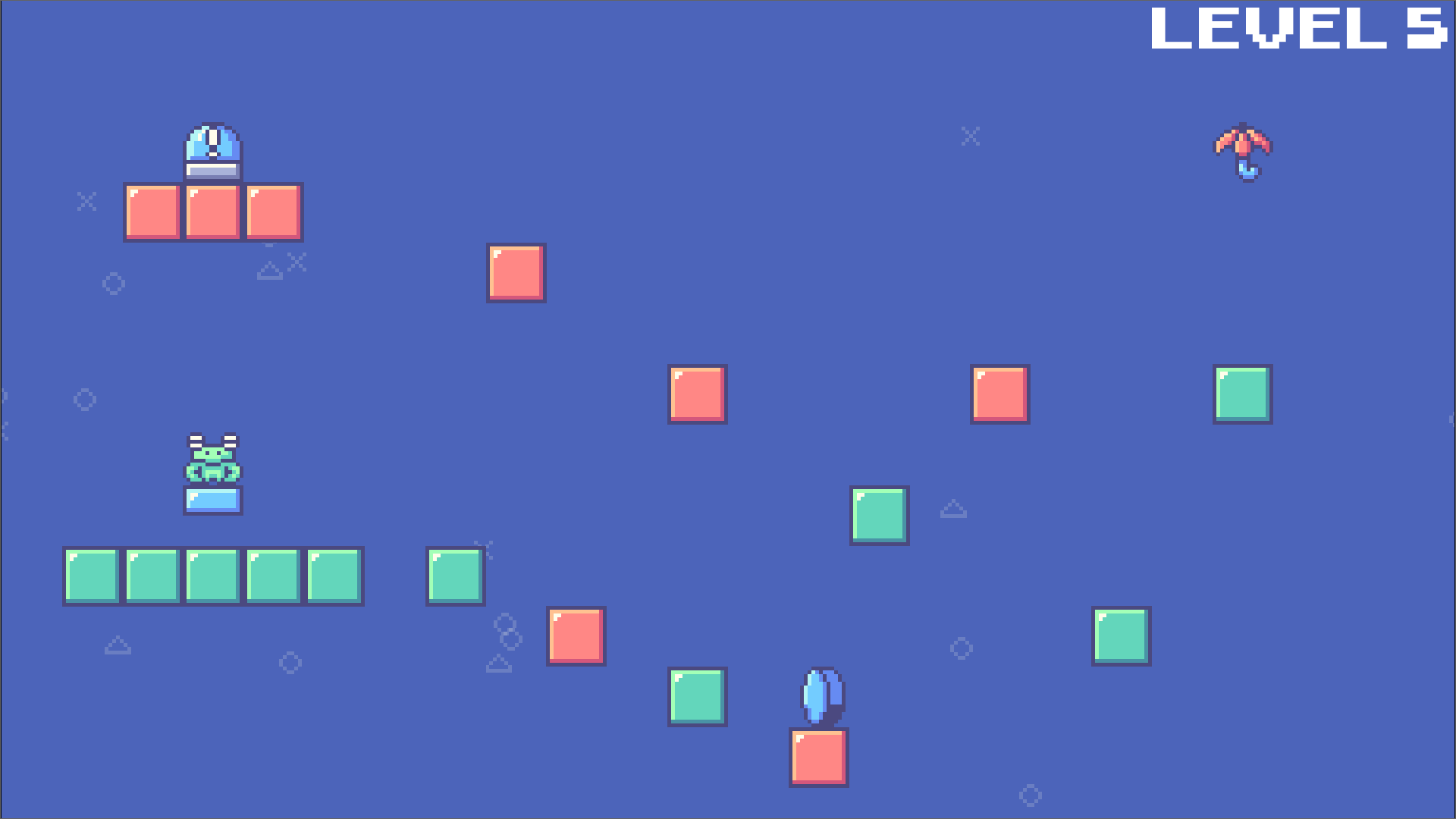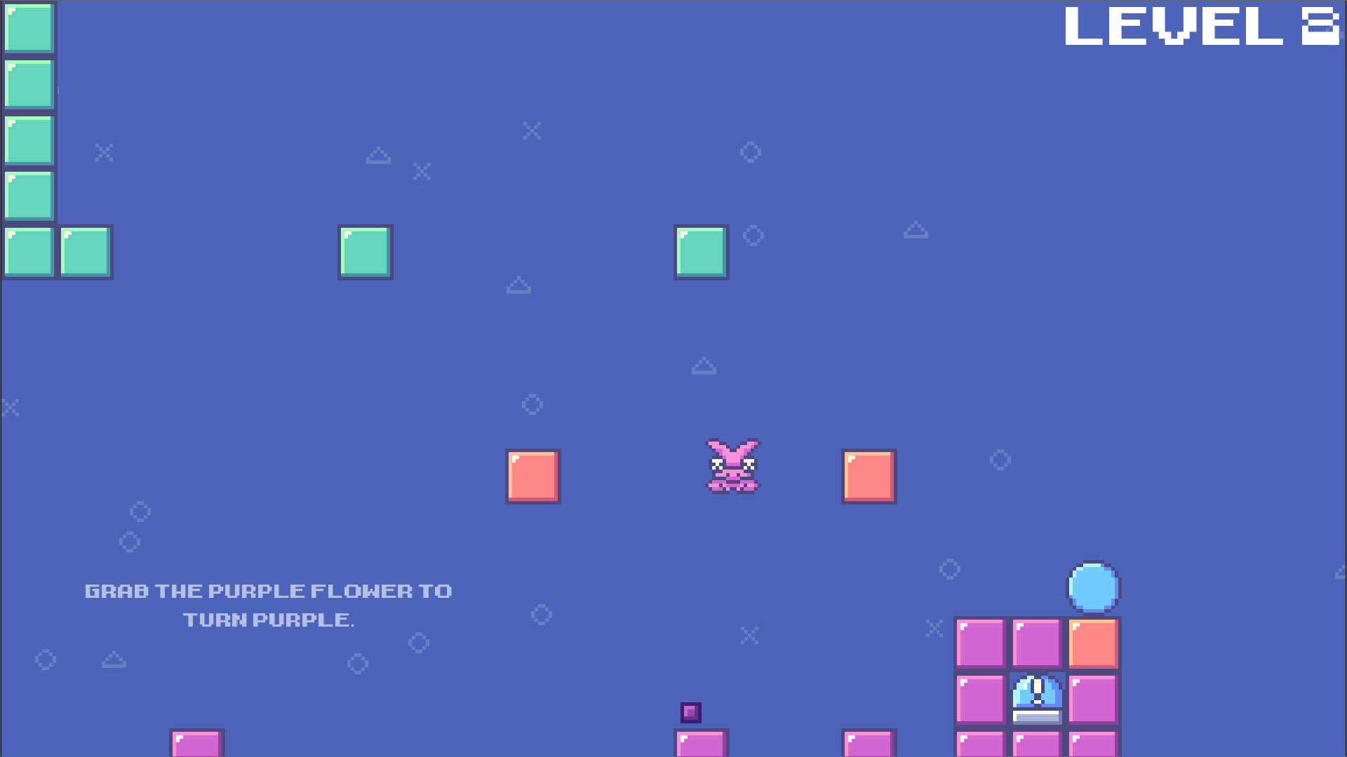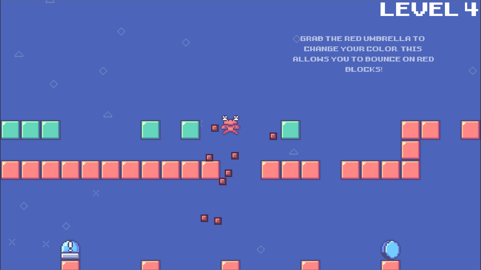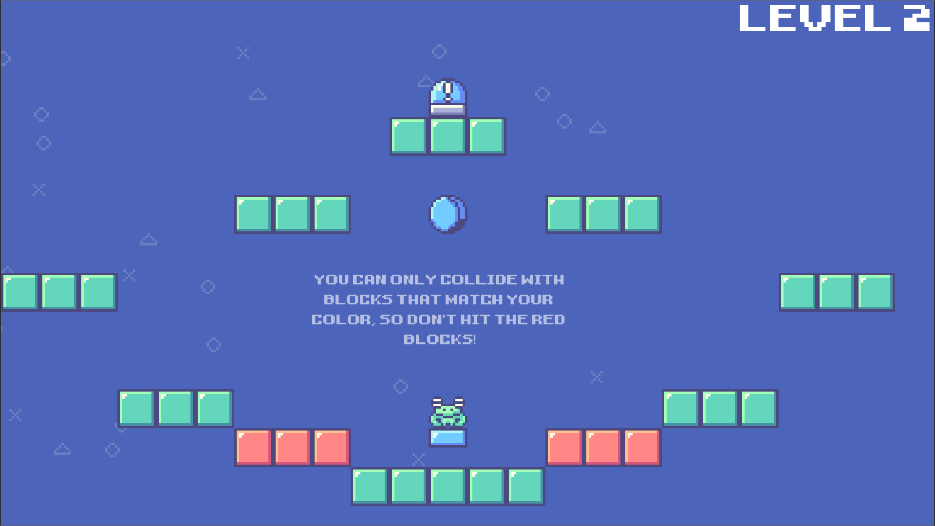 In this game, you play as a frog and you bounce along colored blocks. The goal is to press the blue button and win the stage. However, you can only collide with blocks that match your color. There are also items that will change your color.